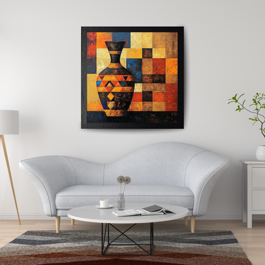 Accrochez un poster africain moderne au-dessus de votre canapé pour créer un point central. Combinez-le avec des coussins ethniques ou des objets artisanaux (vases, paniers, masques) pour une ambiance chaleureuse et équilibrée.